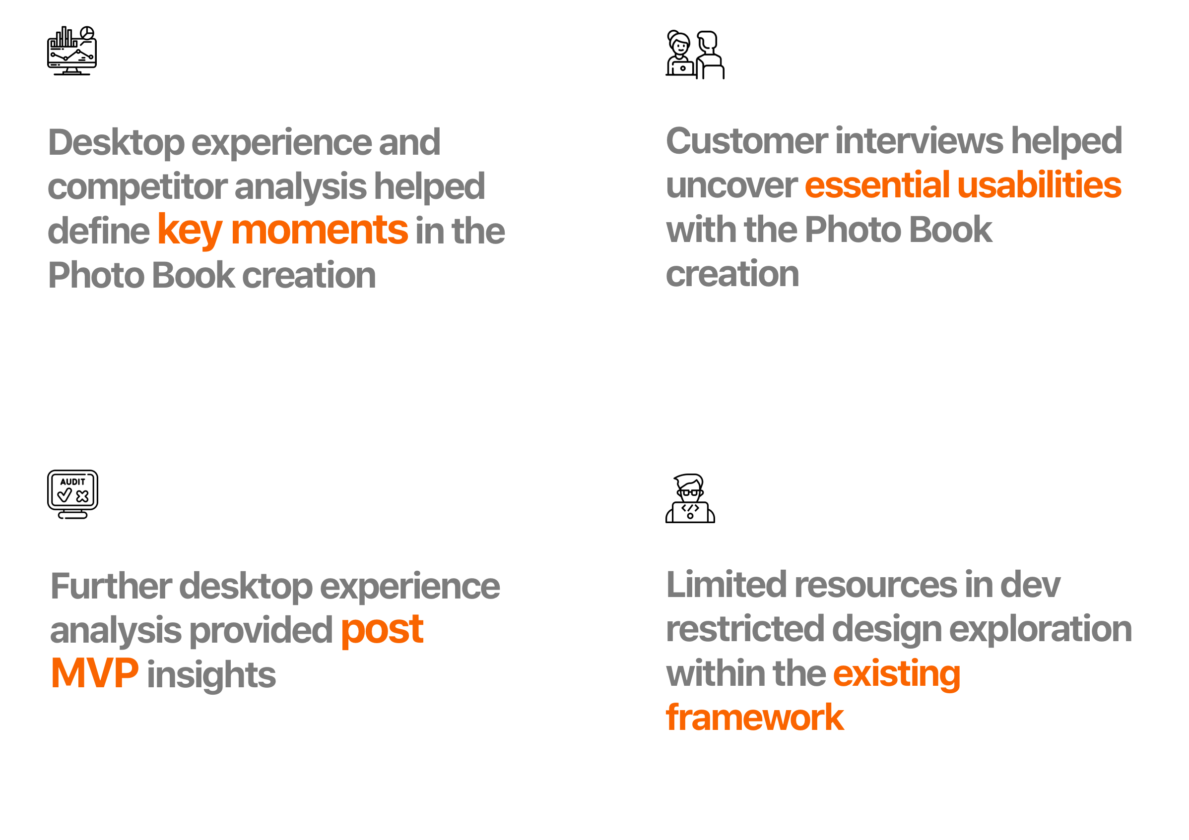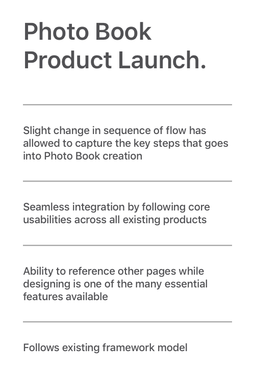 Key takeaways: Understanding the fundamental needs that goes into designing a photo book is crucial when I start consolidating the experience fitting for mobile.