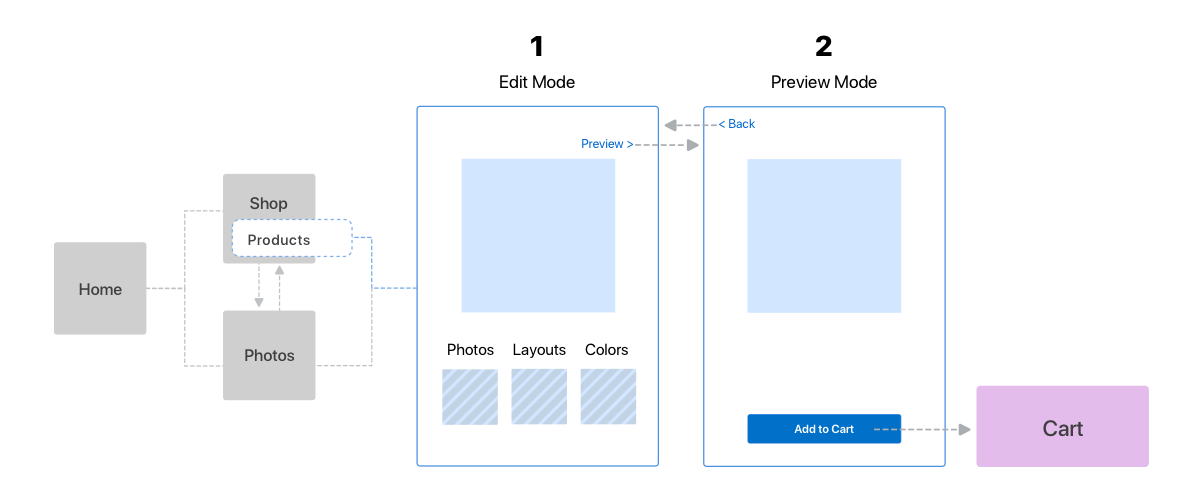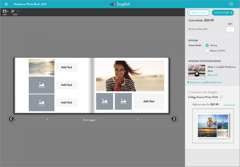 Every page edit returns back to preview to see the design. Users can either save their project or add to their cart to finalize.