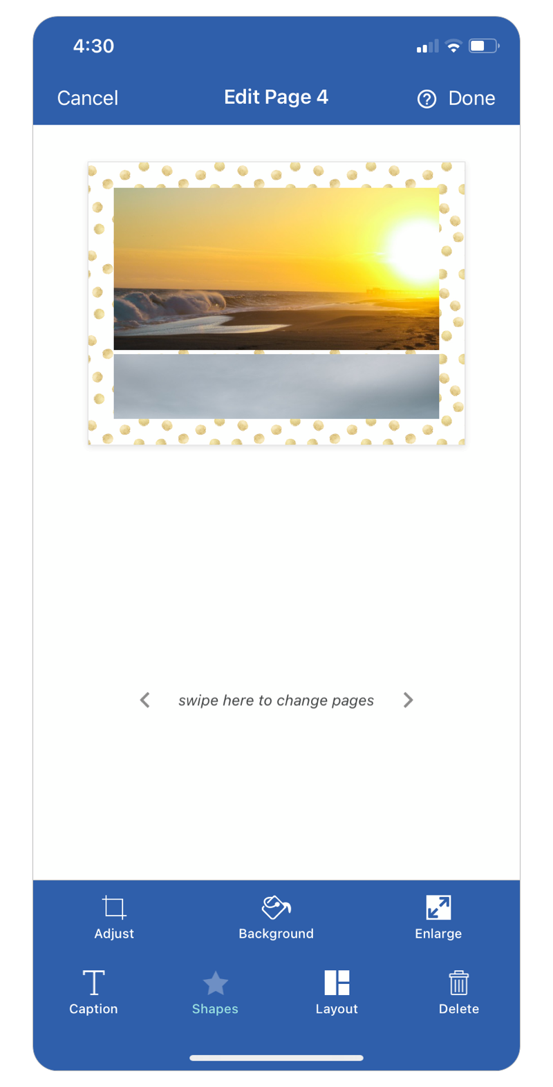 Pages with existing photos can be editted by tapping into them. Edit features like adjust, background, enlarge, caption, shapes, layout, and delete are all part of the customization.