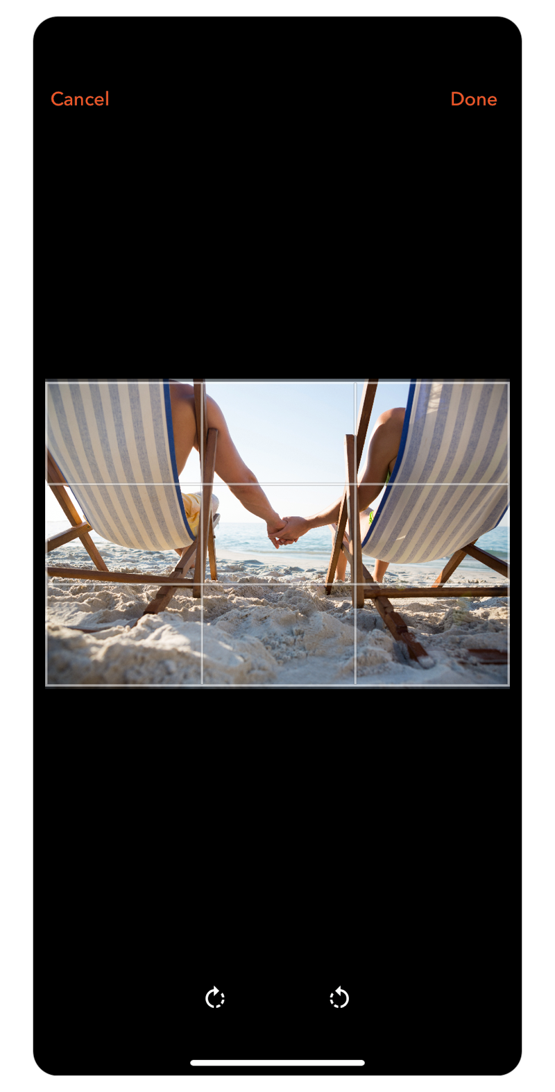 Photo edit is accessed from the toolbar, appearing from the bottom of the screen, sliding up.