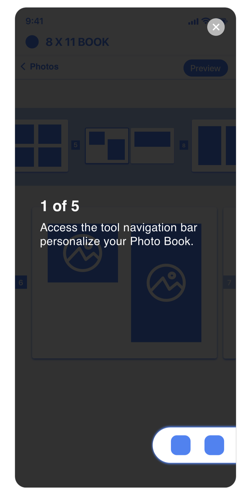 An overlay guiding users in screens and tools they'll come across in creating their book.