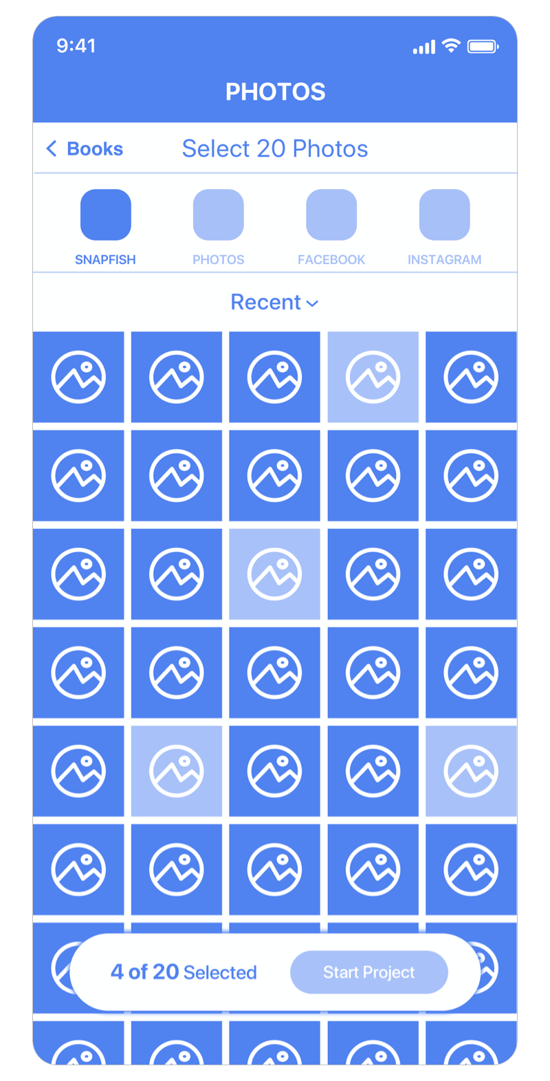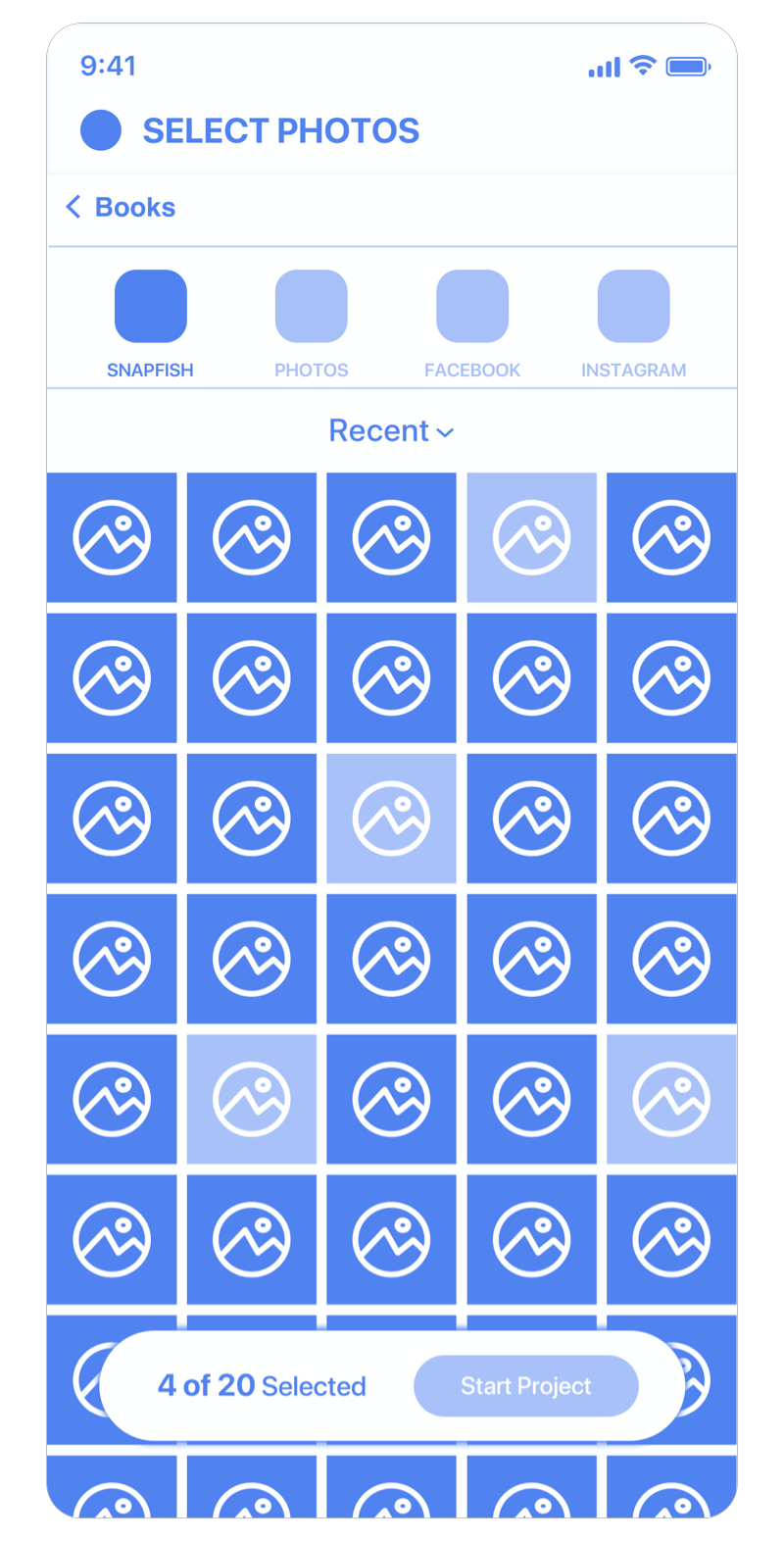 The customer selects 20 required photos to start their Photo Book project. CTA disabled unti fulfilled.